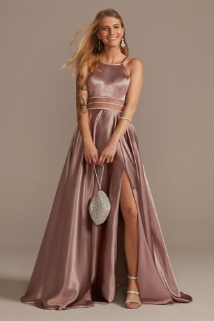 Rows of crystals atop an illusion inset give this high-neck satin A-line dress a glam two-piece look. Just right for prom or any college formal.