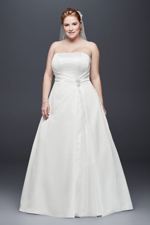 This plus-size satin wedding dress offers the figure-flattering assets of a classic A-line silhouette paired with pretty details like a split skirt overlay and a beaded embellishment at the hip.