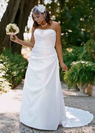 Look red-carpet ready in this glamorous and slimming satin A-line gown. Strapless satin bodice features beautiful beaded inset.Alluring lace-up back creates an hourglass shape on every body type. A-line silhouette and slimming side-drape are the ultimate figure flattering details. Chapel train. Fully lined. Imported polyester. Dry clean only.