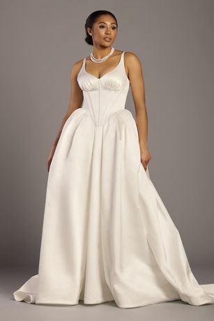 A modern take on a timeless ballgown, this plunging satin dress features a corset basque waist and exaggerated hips for a striking, sculpted silhouette. The lace-up back adds a touch of classic elegance, while the clean lines and dramatic structure make a statement at every angle. Perfect for brides who want bold, architectural glamour with effortless sophistication.