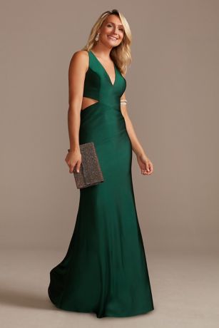 Slinky and sassy, this satin sheath gown captivates with a plunging V-neckline and waist cutouts.