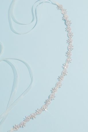 This sash features two curving rows of circle-cut crystals that create a scalloped effect with marquise-cut crystal bursts sitting in each curve to give Art Deco-inspired flair.