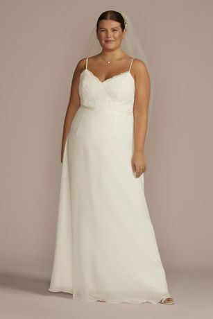 This A-line dress is perfect for a beach or courthouse wedding, and ideal for the bride who loves simple, effortless style. Delicate spaghetti straps top the scalloped lace surplice bodice, while a grosgrain sash nips the waist. A flowing chiffon skirt completes the look.