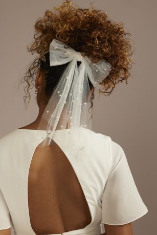 This sheer tulle hair bow topped with scattered pearls adds a sweetly delicate touch to any hairdo.