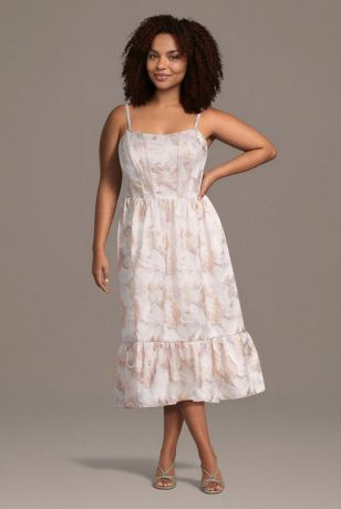 Made of beautiful floral brocade fabric, this midi dress features a corset bodice with optional spaghetti straps for versatile styling. A flounce hem adds a flirty touch.