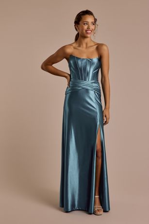 This sculpting satin prom dress has it all: a corset bodice, pleating at the waistline, and a side slit to let you move on the dance floor.