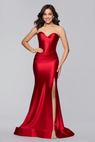 Turn heads in this sculpting satin mermaid dress, featuring a structured corset bodice that defines your shape. The regal, curve-hugging silhouette flares at the hem for dramatic movement, perfect for prom or any special occasion.