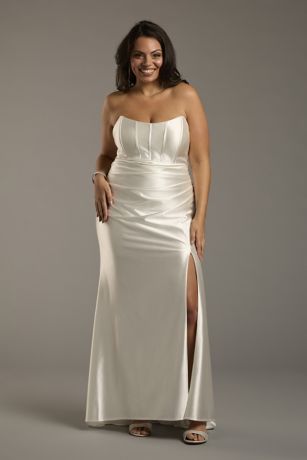 Designed to flatter from every angle, this sculpting satin wedding dress features a structured corset bodice with boning for a flawless fit. Side draping and booty ruching enhance your curves, creating a sultry yet sophisticated bridal look.