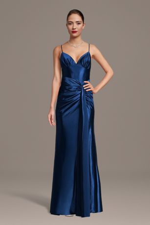 This sculpting satin sheath brings major drama with its draped bodice and curve-hugging silhouette. A lace-up back adds a bold, customizable finish that's perfect for prom.