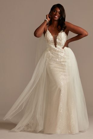 Covered with lustrous sequins and embellished with a hand-placed lace applique, this spaghetti strap plunging wedding dress dares to dazzle. A removable tulle skirt adds a soft, romantic touch to the glamorous look, and gives you the option to switch up your style throughout the day.