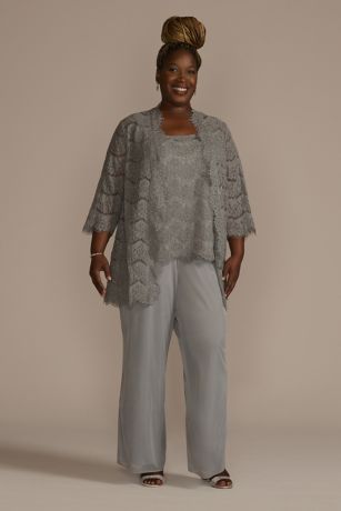 Dazzling sequin lace and comfortable chiffon fabric come together to create an elegant look for any mom or mother figure. The three-piece set features a matching tank, scalloped lace jacket, and straight leg pants.
