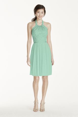 - Features a lace bodice with an illusion neckline and tie back halter.