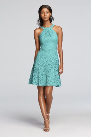 The cutaway Y-neckline on this short lace bridesmaid dress gives you a balanced silhouette. The scalloped hem adds a sweet touch.