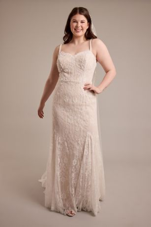 A boho beauty, this mermaid wedding dress follows the figure with soft Chantilly lace fabric. Delicate spaghetti straps and a sweetheart neckline add to the romance.