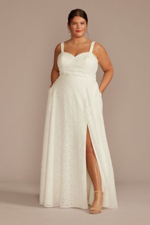 Make the aisle your runway in a dazzling corset bodice wedding dress. Allover sparkle lace catches the light with every twirl of the A-line skirt, and a lace-up back adds a sexy charm.