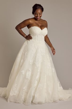 Embrace timeless elegance in our strapless organza ball gown with a structured corset bodice and a basque waist. Adorned with luxe floral details and a dramatic full skirt, this wedding dress is an iconic bridal look. Plus, it has pockets!