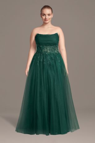 This showstopping strapless A-line design features an illusion bodice covered in sequin appliques, with optional strap for a custom fit. Perfect for prom night or another major moment.