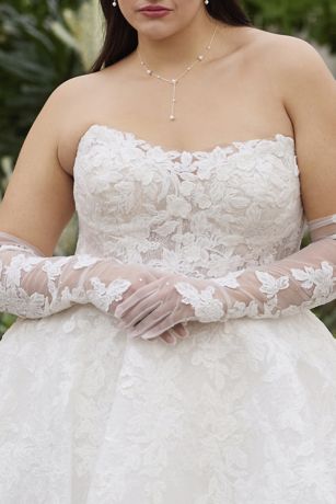 Finished with 66 beaded lace appliques and 110 embroidered 3D floral accents, the wedding dress's design is elevated with a modern sculpted neckline and sweeping skirt. Tulle gloves complete the look, adding a regal touch to this truly statement-making gown.