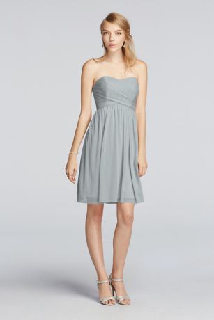 This short strapless bridesmaid dress couldn't be more versatile, thanks to a diagonally pleated mesh sweetheart bodice and flowing above-the-knee skirt.