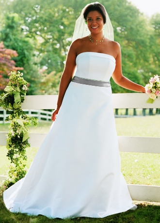 Strapless satin A-line, cuff neckline and pleated sash at waist.