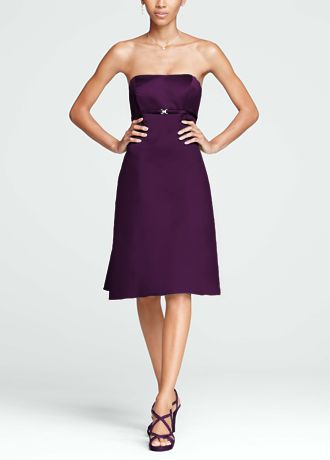 - Strapless satin bodice features sparkling brooch and empire waist that helps create a stunning silhouette.