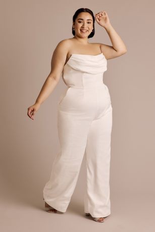With a sculpted strapless neckline and illusion corset back, this stretch satin jumpsuit is ready for your big day or any bride-to-be celebration.