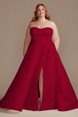 This stunning strapless satin wedding dress with a skirt slit is the epitome of elegance and sophistication. Designed by the renowned bridal brand, David's Bridal, it is guaranteed to make any bride feel like a true princess on her special day.