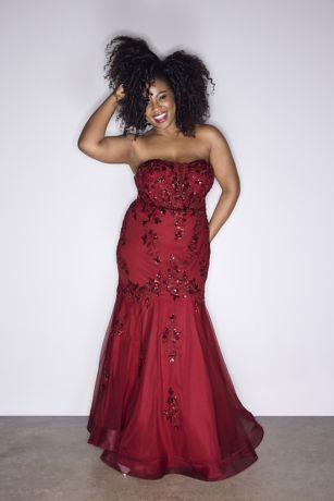Adorned with lace appliques, this strapless tulle mermaid dress creates a stunning, romantic silhouette for any special occasion.