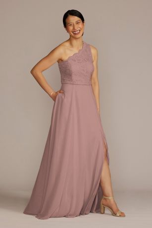 The best of both worlds, this one-shoulder bridesmaid dress combines a scalloped stretch-lace bodice and a flowy chiffon skirt with slit. Features side pockets.