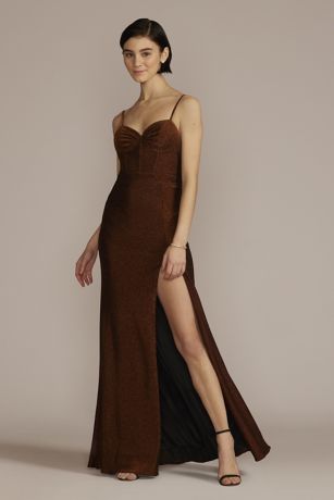 Brilliant metallic moves with you in this stretchy sheath gown, featuring a ruched sweetheart neck and corset detail.