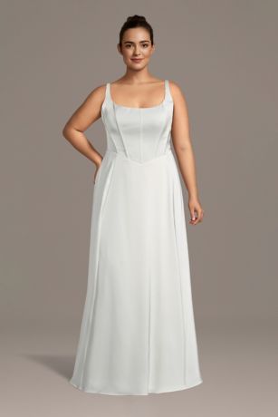 This matte satin A-line wedding dress features a structured corset bodice and flattering basque waist for a romantic, silhouette. Finished with classic tank straps, it's the perfect blend of modern grace and vintage-inspired charm. The Edit by DB Studio is a modern, style-forward collection offering elevated looks for weddings and every RSVP.