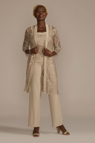 This three-piece pants suit offers a comfortably chic look for most of Mom's events. Soft, relaxed trousers give the kind of ease she loves, while the embroidered top and illusion lace jacket shimmer with the sparkle she deserves.