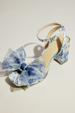 Pick a statement shoe for the big day or another special event! These toile floral print platform block heels get an extra-fanciful touch from the pearl-trim vamp bow.
