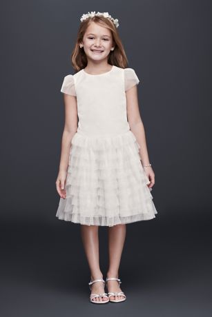 A fun and frilly choice for a lighthearted little one, this flower girl dress is crafted with tiny tulle ruffles and sheer cap sleeves.