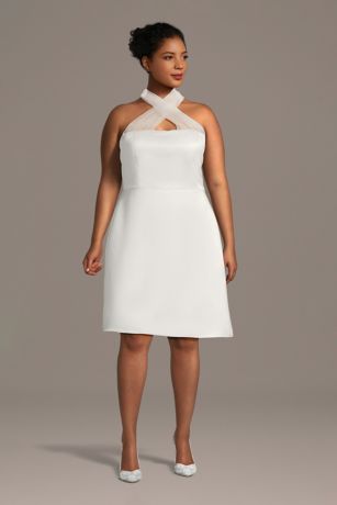 This flirty mini dress pairs a soft tulle halter neckline with a sleek satin skirt for the perfect balance of romance and edge. Ideal for rehearsal dinners, bachelorette nights, or any bridal moment in between. The Edit by DB Studio is a modern, style-forward collection offering elevated looks for weddings and every RSVP.