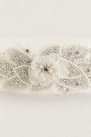 This gorgeous tulle headwrap features flowers adorned with delicate ivory pearls!
