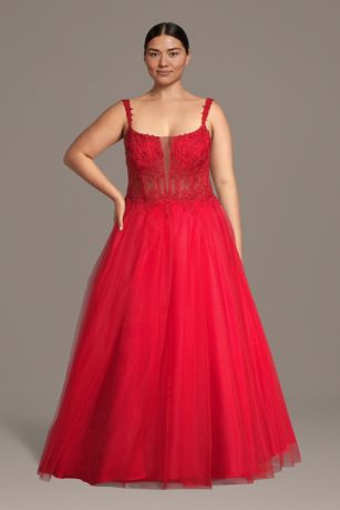 Make a statement in this dramatic tulle ball gown, featuring an illusion plunge neckline and intricate applique detailing. Perfect for prom, it combines volume, sparkle,and elegance for a showstopping, unforgettable look.