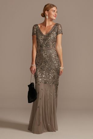 Covered with intricate beadwork, this V-neck dress has a romantic feel with a trail of beaded flowers and flowy skirt godets.
