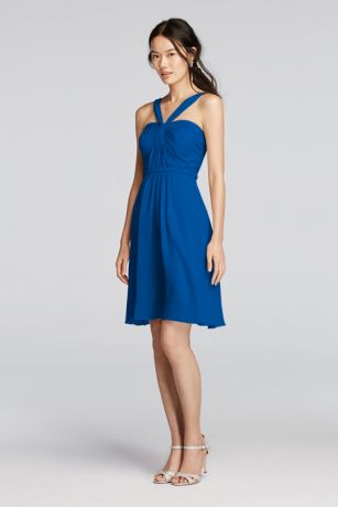 We love the artful draping and unexpected Y-neckline on this short chiffon bridesmaid dress.